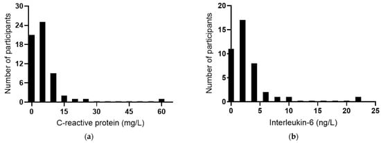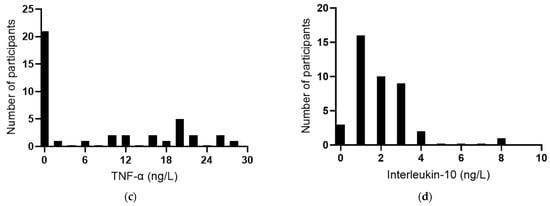 Baseline inflammatory biomarker status in the study cohort. Frequency distributions of: (a) C-reactive protein (n = 60), (b) interleukin-6 (n = 41), (c) tumour necrosis factor-alpha (TNF-α; n = 40), and (d) interleukin-10 (n = 41).