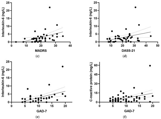 Correlations of inflammatory biomarkers with mood scores. Correlations of interleukin-6 with (a) the Edinburgh Postnatal Depression Scale (EPDS; r = 0.319, p = 0.04), (b) the Clinical Global Impressions—Severity Scale (CGI-S; r = 0.528, p < 0.001), (c) the Montgomery and Åsberg Depression Rating Scale (MADRS; r = 0.563, p < 0.001), (d) the Depression Anxiety Stress Scale 21 (DASS-21; r = 0.379, p = 0.015), and (e) the Generalized Anxiety Disorder-7 (GAD-7; r = 0.442, p = 0.005). (f) Correlation of C-reactive protein with GAD-7 (r = 0.260, p = 0.05). Dashed lines indicate 95% confidence intervals.