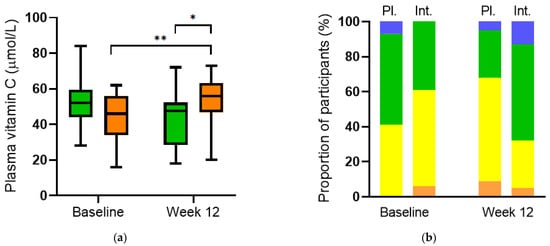 Plasma vitamin C concentrations before and after intervention. (a) Vitamin C increased over time in the intervention group (orange boxes; ** p = 0.007) and relative to placebo at week 12 (green boxes; * p = 0.01). (b) Categories of vitamin C status: hypovitaminosis C (≤23 µmol/L; orange bars), inadequate (<50 µmol/L; yellow bars), adequate (≥50 µmol/L; green bars), saturating (≥70 µmol/L; blue bars). Pl., placebo; Int., intervention.