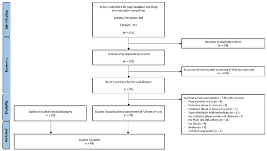 In total, 616 articles (284 from PubMed and 332 from Embase) were identified. After removing duplicate records, 553 publications were screened by their titles and abstracts. Following this first screening, 85 full-text articles were assessed for eligibility. Among them, 28 were relevant according to the criteria. Thirty-five supplemental articles identified in the bibliographies were added. Thus, 63 studies were included in this narrative review. The selected articles were comparative studies between healthy subjects and patients suffering from an MDE in the context of MDD, according to disease stage and clinical features. A summary of the biomarkers identified from the 63 articles is provided in Table 1, Table 2, Table 3, Table 4, Table 5, Table 6, Table 7, Table 8 and Table 9. Biomarkers were grouped according to their nature (e.g., antioxidant enzymes, non-enzymatic antioxidants, ROS-producing enzymes, ROS/RNS, oxidative damage products and others), the examined biological matrix (i.e., serum, plasma, erythrocytes), and clinical characteristics.