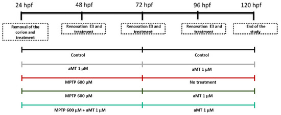 Embryos at 24 hpf (hours postfertilization) were manually dechorionated and distributed in a 24-well plate containing six embryos per well and with 1 mL of E3 medium, and the embryos were maintained with or without the treatment up to 120 hpf. The experiments were performed in triplicate, and the following groups were assigned: (1) control group, with no treatment; (2) MPTP group, treated with MPTP (N-methyl-4-phenyl-1,2,3,6-tetrahydropyridine) (Sigma-Aldrich, Madrid, Spain) freshly prepared in E3 medium at a final concentration of 600 μm in the well; (3) Melatonin group, treated with melatonin (Fagrón Ibérica, Barcelona, Spain) dissolved in 0,1% dimethylsulfoxide (DMSO) and used at a final concentration of 1 μm; (4) MPTP+Melatonin curative group, in which MPTP was maintained from 24 hpf to 72 hpf and melatonin was administered from 72 hpf to 120 hpf; and (5) MPTP+Melatonin preventive group, in which MPTP was maintained from 24 hpf to 120 hpf, and melatonin was administered together with MPTP at 24 hpf and was maintained up to 120 hpf. Each day, half of the treatment or E3 medium was renewed. At 120 hpf, the embryos were sacrificed using tricaine (Figure 1).