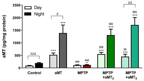Endogenous levels of melatonin in zebrafish embryos during the day (light color) and during the night (dark color). Control, untreated embryos; aMT, control embryos treated with 1 μM melatonin; MPTP, embryos incubated with 600 μM MPTP; MPTP+MT2, embryos treated with 600 μM MPTP from 24 hpf to 72 hpf plus 1 μM melatonin from 72 hpf to 120 hpf; MPTP+aMT5, embryos treated with 600 μM MPTP from 24 hpf to 72 hpf plus 1 μM from 24 hpf to 120 hpf. Data are presented as mean ± SEM. * p < 0.05 vs. control; *** p < 0.001 vs. control, ### p < 0.001 vs. aMT; $$ p < 0.01 vs. MPTP; $$$ p < 0.001 vs. MPTP; δ p < 0.05 vs. day; δδ p < 0.01 vs. day; δδδ p < 0.001 vs. day. Unpaired t test.