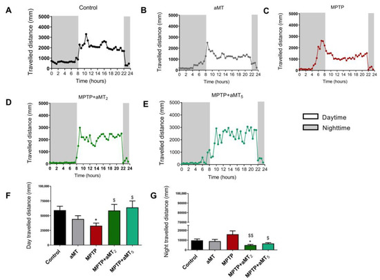 Total distance traveled during 24 h by zebrafish embryos. The light and dark conditions (shaded part) are 14:10 h, respectively. (A) control rhythm; (B) aMT group; (C) MPTP group; (D) MPTP+aMT2 group; (E) MPTP+aMT5 group; (F) total day travelled distance; and (G) total night travelled distance. Data are presented as mean ± SEM. * p < 0.05 vs. control; $ p < 0.05 vs. MPTP; $$ p < 0.01 vs. MPTP. Unpaired t test.