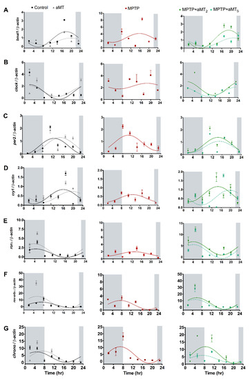 Regarding regulatory genes, the control group shows a bmal1 rhythm that was unmodified by aMT (Table S2.1) but blunted after MPTP administration (Figure 4A). Both types of melatonin treatments, aMT2 and aMT5, recovered normal bmal1 rhythm (Figure 4A). There were no significant differences between both treatments of melatonin plus MPTP and the control and aMT groups (Table S2.1).