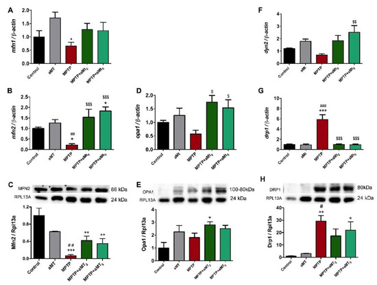 Analysis of the genes and proteins involved in mitochondrial dynamics. Regarding fission, the following markers were analyzed: (A) Expression of mfn1 mRNA; (B) Expression of mfn2 mRNA and (C) levels of Mfn2 protein in the same experimental groups; (D) Expression of opa1 mRNA and (E) levels of Opa1 protein in the same experimental groups. Fusion markers analyzed were: (F) dyn2 mRNA expression; (G) drp1 mRNA expression; and (H) Drp1 protein levels in the same experimental groups. Data are presented as mean ± SEM. * p < 0.05 versus control; ** p < 0.01 vs. control; *** p < 0.001 vs. control; # p < 0.05 vs. aMT; ## p < 0.01 vs. aMT; ### p < 0.001 vs. aMT; $ p < 0.05; $$ p < 0.01 vs. MPTP; $$$ p < 0.001 vs. MPTP. One-way ANOVA with a Tukey’s post hoc test.