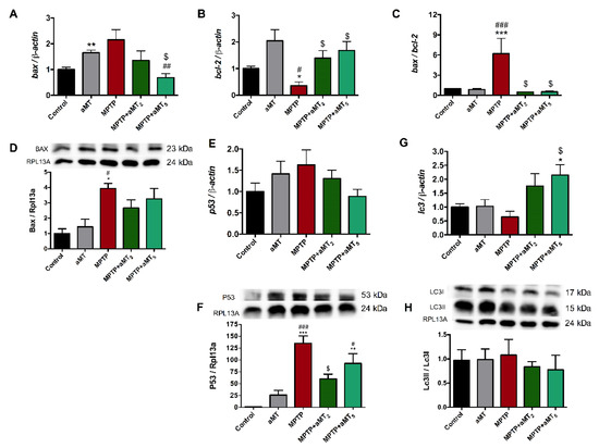 Analysis of apoptotic and autophagy pathways. (A) bax and (B) bcl-2 mRNA expression in the studied groups, and the bax/bcl-2 ratio (C). (D) protein levels of Bax. (E) p53 mRNA expression and (F) P53 protein levels. (G) mRNA expression of lc3 and (H) protein ratio of Lc3II/Lc3I. Data are presented as mean ± SEM. * p < 0.05 vs. control; ** p < 0.01 vs. control; *** p < 0.001 vs. control; # p < 0.05 vs. aMT; ## p < 0.01 vs. aMT; ### p < 0.001 vs. aMT; $ p < 0.05 vs. MPTP. Unpaired t test and One-way ANOVA with a Tukey’s post hoc test.