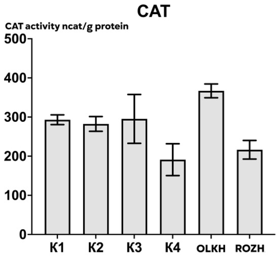 CAT activity was evaluated according to the method described by Goth [24]. A solution containing 1 mL of 65 µM H2O2 in a 60 mM K-Na-phosphate buffer (substrate) was used for assessment. After 60 s after the addition of the enzyme extract (in a volume of 200 µL), the reaction was stopped by adding 1 mL of 32.4 mM ammonium molybdate ((NH4)6Mo7O24·4H2O), spectrophotometry was performed at a wavelength of 410 nm, and the adsorption value of the sample (Asample) was obtained. Also, to estimate the activity of the enzyme, mixtures A1, A2, and A3 were measured at the same wavelength. The A1 mixture contained 1 mL of the substrate, 1 mL of ammonium molybdate, and 200 µL of enzyme extract. The A2 mixture contained 1 mL of the substrate, 1 mL of ammonium molybdate, and 200 µL of 60 mM K-Na-phosphate buffer. The absorption value of the A3 mixture was achieved by mixing 1.2 mL of 60 mM K-Na-phosphate buffer and 1 mL of ammonium molybdate. The catalase activity was calculated according to the following formula: