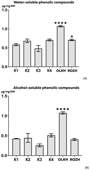 The content of the sum of water- and alcohol-soluble phenolic compounds was evaluated by the Folin-Ciocalteu reagent method [29].