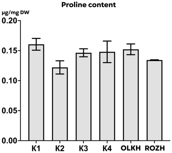 Extraction was carried out with hot distilled water at the ratio of raw materials:extractant—1:100 in a water bath for 10 min at a temperature of 100 °C. Then the extracts were centrifuged at 5000 rpm for 5 min. The supernatants were used for analysis. To measure the proline content, a solution was used: 2 mL of glacial acetic acid (water-free acetic acid), 2 mL of ninhydrin reagent prepared without heating (1.25 g of ninhydrin, 30 mL of glacial acetic acid, 20 mL of 6M H3PO4), 2 mL of extract. The samples were incubated in a water bath for 20 min at a temperature of 100 °C and then quickly cooled to room temperature. The measurement was made at a wavelength of 520 nm against the control (a mixture of the same composition as for the experimental sample, but distilled water was added in the same volume instead of the extract).