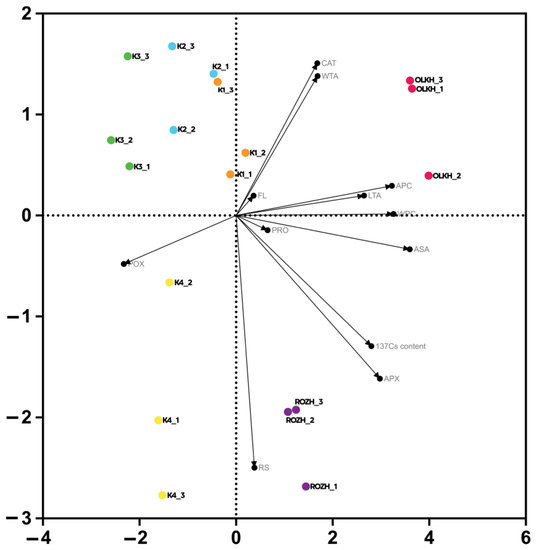 The resulting scattering graph showed the distribution of changes in the content of antioxidant compounds and the activity of antioxidant enzymes and revealed a positive correlation between APC, LTA, WPC, ASA, and PRO and a negative correlation of POX with these variables. Similarly, CAT, WTA, and PRO had a positive correlation. The content of 137Cs and APX had a positive correlation, and RS did not correlate with any of the parameters. In general, biplot PCA showed that the changes in the parameters of the antioxidant system were greater relative to spatial fluctuations. Thus, abiotic loads in the form of gamma radiation seem to have a significant effect on the antioxidant system of H. tuberosus plants.
