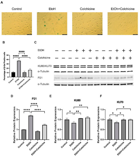 Colchicine inhibited endothelial senescence and restored the relative protein expression of aging-associated biomarkers. (A) Senescence in endothelial cells after 24 h of treatment with different conditions. (B) Colchicine subdued ethanol (EtOH)-induced senescence in endothelial cells. (C) Western blot showing protein expression of P21, KU80, and KU70. (D) Colchicine attenuated the relative protein expression of P21 in endothelial cells after ethanol exposure. (E,F) Colchicine recovered the relative protein expression of KU70 and KU80 in endothelial cells treated with ethanol. α-Tubulin was used as a loading control. Data are the mean of independent biological triplicates. The data was analyzed by performing one-way ANOVA followed by Tukey’s test. Scale bar = 100 µm; error bars represent the SD (**** p < 0.0001, ** p < 0.01, and * p < 0.05).