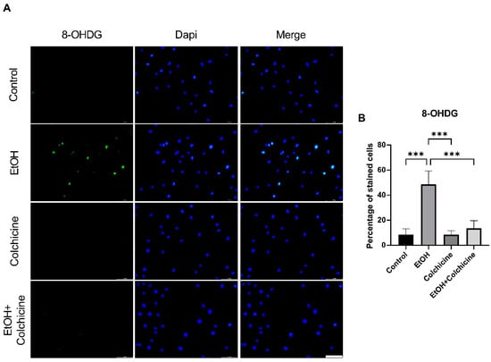 The metabolism of ethanol produces reactive oxygen species (ROS) and reactive nitrogen species, resulting in increased oxidative stress [35]. Colchicine inhibited ethanol-induced oxidative stress in endothelial cells and lowered the percentage of oxidative stress-associated biomarker 8-OHDG positive cells (control = 8.569 ± 4.573%, EtOH = 48.62 ± 10.74%, colchicine = 8.553 ± 3.115%, EtOH + colchicine = 13.60 ± 6.001%, *** p = 0.001, n = 3; Figure 2). Colchicine obviated oxidative stress in ethanol-treated endothelial cells, which is in accordance with the previously reported findings [36,37].
