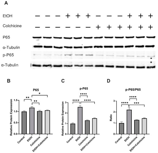 Colchicine inhibited nuclear factor kappa B (NF-κB) activation: (A) Western blots for proteins of P65 and p-P65. Colchicine obviated the relative protein expression of (B) P65 and (C) p-P65 in ethanol-treated endothelial cells. (D) The ratio of p-P65/P65 was significantly decreased in ethanol-treated endothelial cells exposed to colchicine. α-Tubulin was used as loading control. Biological triplicates were used for the experiment. Data was analyzed by performing one-way ANOVA followed by Tukey’s test. Error bars represent the SD (**** p < 0.0001, *** p < 0.001, ** p < 0.01, and * p < 0.05).