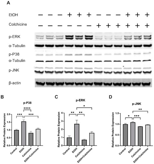 Colchicine inhibited mitogen activated protein kinases (MAPKs) activation: (A) Western blots for proteins of p-P38, phosphorylated extracellular signal-regulated protein kinase (p-ERK), and phosphorylated c-Jun N-terminal kinase (p-JNK). Colchicine averted relative protein expression of (B) p-P38, (C) p-ERK, and (D) p-JNK in ethanol-treated endothelial cells. α-Tubulin was used as a loading control for all proteins expression except p-JNK. β-actin was used as a loading control for only p-JNK on a separate membrane. The experiment was performed with independent biological triplicates. The data was analyzed by performing one-way ANOVA followed by Tukey’s test. Error bars represent the SD (**** p < 0.0001, *** p < 0.001, ** p < 0.01, and * p < 0.05).