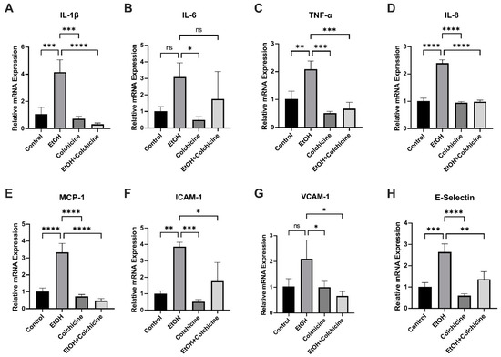 Colchicine attenuated the relative mRNA expression of SASP-associated inflammatory markers. Colchicine reduced the relative mRNA expression of (A) interleukin (IL)-1β, (C) tumor necrosis factor-α (TNF-α), (D) IL-8, (E) monocyte chemoattractant protein-1 (MCP-1), (F) intercellular adhesion molecule-1 (ICAM-1), and (H) endothelial selectin (E-Selectin) in ethanol-treated endothelial cells. Ethanol did not significantly increase the relative mRNA expression of (B) IL-6 or (G) vascular cell adhesion molecule-1 (VCAM-1). Colchicine significantly lowered the relative mRNA expression of VCAM-1 in ethanol-treated endothelial cells. β-actin was used as a loading control. qPCR data are the mean of three independent technical replicates. The data was analyzed by performing one-way ANOVA followed by Tukey’s test. Error bars represent the SD (**** p < 0.0001, *** p < 0.001, ** p < 0.01, and * p < 0.05), ns: not significant.