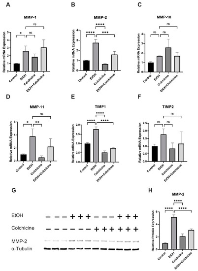 Colchicine abated the relative mRNA and relative protein expression of matrix metalloproteinase (MMP)2. Colchicine did not ameliorate the relative mRNA expression of (A) MMP1 or (D) MMP-11. Ethanol and colchicine did not alter the relative mRNA expression of (C) MMP-10 or (F) tissue inhibitor of metalloproteinase (TIMP)2. Colchicine attenuated relative mRNA expression of (E) TIMP1 and (B) MMP-2 and relative protein expression of (G,H) MMP-2 in ethanol-treated cells. β-actin for qPCR and α-tubulin for WB were used as a loading control. qPCR data are the mean of three independent technical replicates and WB data are the mean of the independent biological triplicates. The data was analyzed by performing one-way ANOVA followed by Tukey’s test. Error bars represent the SD (**** p < 0.0001, *** p < 0.001, ** p < 0.01, and * p < 0.05), ns: not significant.