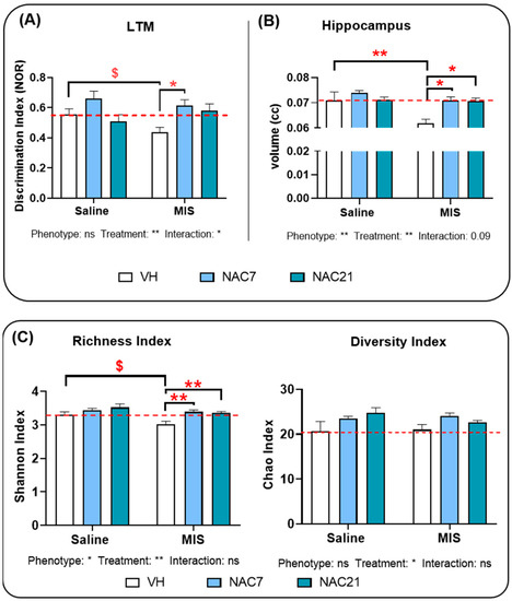 (A) Discrimination index. The effect of NAC treatment on the long-term memory (LTM) discrimination index between objects in the novel object recognition test (NOR) (Saline VH, N = 9; Saline NAC7, N = 6; Saline NAC21, N = 8; MIS VH, N = 7; MIS NAC7, N = 8; MIS NAC21, N = 6). (B). Hippocampal volume. The effect of NAC on hippocampal volume in the Saline (control) and MIS (pathological) animal groups, measured by MRI. (Saline VH, N = 7; Saline NAC7, N = 12; Saline NAC21, N = 12; MIS VH, N = 6; MIS NAC7, N = 12; MIS NAC21, N = 12). (C). Bacterial diversity and richness. Representation of the changes in bacterial diversity and richness, as measured by Shannon and Chao Indexes in Saline and MIS animals after a preventive treatment with NAC during pregnancy. (Saline VH, N = 8; Saline NAC7, N = 11; Saline NAC21, N = 11; MIS VH, N = 11; MIS NAC7, N = 10; MIS NAC21, N = 9). [Data is shown as mean ± SEM. 2-way ANOVA followed by a posthoc test, Tukey’s multiple comparison (* p < 0.05, ** p < 0.01) and unpaired t-test ($ p < 0.05) are shown. ns: non-significant]. The red dotted line indicates the mean value of the control group (Saline-VH).