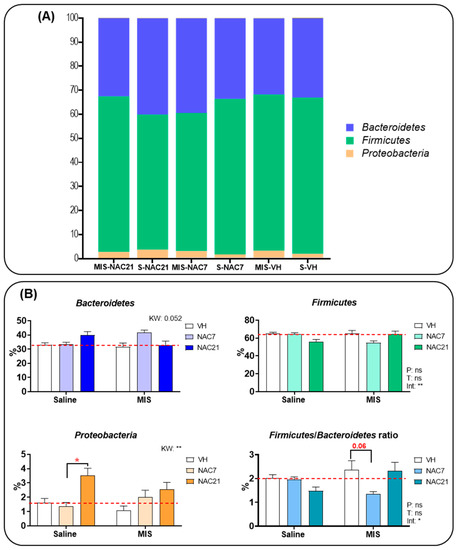 (A) The nested bar at the phylum level. The nested bar graph shows the mean percentage composition of the most representative phyla for each group. Bacteroidetes (purple), Firmicutes (green) and Proteobacteria (orange) were the most common phyla. (B) Gut microbiota composition at the phylum level. Graphs show the mean percentage composition of the 3 most representative phyla and the Firmicutes/Bacteroidetes ratio in the Saline and MIS animals treated with NAC during gestation. (Saline VH, N = 8; Saline NAC7, N = 11; Saline NAC21, N = 11; MIS VH, N = 11; MIS NAC7, N = 11; MIS NAC21, N = 11). Data are shown as mean ± SEM. 2-way ANOVAs followed by Tukey posthoc test or Kruskal–Wallis (KW) analysis followed by Dunn’s multiple comparison are shown (* p < 0.05, ** p < 0.01) [ns: non-significant, P: Phenotype, T: Treatment, int: Interaction]. The red dotted line indicates the mean value of the control group (Saline-VH).