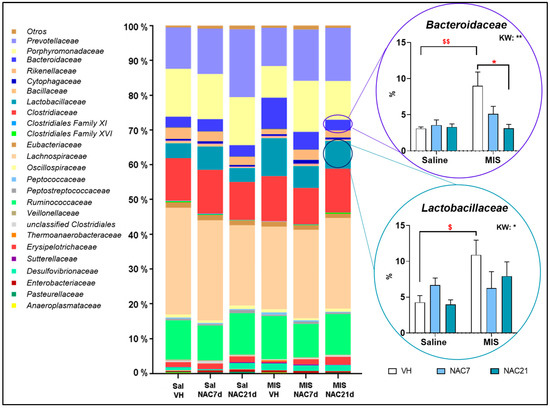 Gut microbiota composition at the family level. Selection of the most representative microbiota families altered in the MIS model and modified by NAC treatment. Each column shows the average of % changes in the composition of microbiota at the family level. (Saline-VH: 8, Saline-NAC7: 11, Saline-NAC21: 11, MIS-VH: 11, MIS-NAC7: 11, MIS-NAC21: 11). Data is shown as mean ± SEM. Kruskal–Wallis (KW) analysis followed by Dunn’s multiple comparison test (* p < 0.05, ** p < 0.01, *** p < 0.001) and Mann–Whitney test ($ p < 0.05, $$ p < 0.01) are shown.