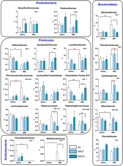 As for the families of the phylum Bacteroidetes, the MIS challenge significantly affected two families. Bacteroidaceae populations were strongly increased in MIS-VH vs. Saline-VH animals (p < 0.01), an effect that was restored to normal conditions with NAC treatment in a dose-dependent manner. The Rikenellaceae family was reduced in MIS-VH vs. Saline-VH group, and NAC treatment restored these populations. With respect to Proteobacteria families, the Pasteurellaceae taxon increased in MIS-NAC21 vs. MIS-VH animals. Finally, regarding the Actinobacteria phylum, the Corynebacteriaceae taxon was not present in the MIS groups. Additionally, in the case of Bifidobacteriaceae, no populations were detected in the Saline groups but increased in MIS-VH animals, while these populations were strongly reduced in the MIS-NAC7 and MIS-NAC21 groups.