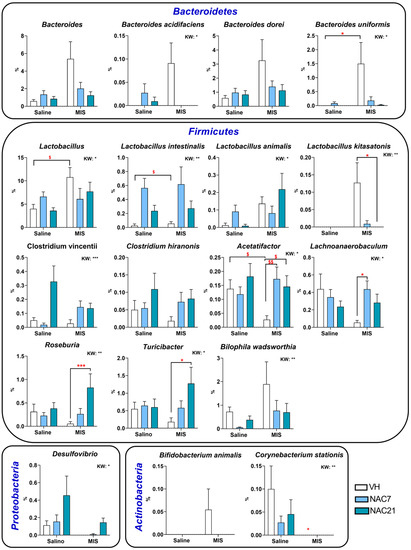 For the phylum Bacteroidetes, in general, MIS-VH animals showed a strong increase in populations of the genus Bacteroides (such as in B. uniformis), which showed a tendency to decrease in a dose-dependent manner with NAC treatments.