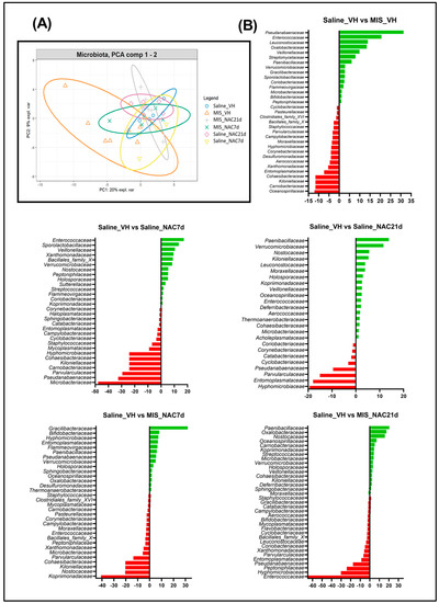 The main bacterial families that better discriminate between healthy and pathological controls (Saline_VH and MIS_VH) include Pseudanabaenaceae, Enterococcaceae and Leuconostocaceae (among others) for MIS_VH group, and Oceanospirillaceae, Carnobacteraceae and Kiloniellaceae (among others) for Saline_VH group. The main bacterial family that better discriminated between those groups that were treated with NAC during 21 days is Paenibacillaceae, which belongs to the Firmicutes phylum.