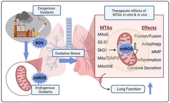 Oxidative stress has been identified as a key mechanism driving the pathogenesis of COPD, and mitochondria play an important role in these mechanisms through the generation of endogenous reactive oxygen species (ROS) [15,16]. Emerging evidence suggests that mitochondrial ROS (mtROS) contributes to widespread mitochondrial dysfunction in COPD and drives chronic inflammation in the lungs. Thus, therapeutic treatments aimed at targeting mtROS generation hold great promise for COPD. In this review, we discuss the role of mitochondria-derived oxidative stress in COPD and the therapeutic efficacy of MTAs as a treatment for chronic lung disease. Current challenges and new tools for targeting mtROS are discussed.