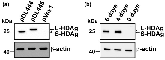 Expression of HDV antigens in non-infectious models. (a) Huh7 cells were transfected with plasmids encoding S-HDAg (pDL444), L-HDAg (pDL445), or pVax1 empty vector, and the expression of HDV antigens was analyzed by Western blotting 48 h post-transfection. (b) Huh7 cells were transfected with the pSVLD3 plasmid harboring the trimeric HDV genome, and the expression of HDV antigens was assessed by Western blotting 4 and 6 days post-transfection.