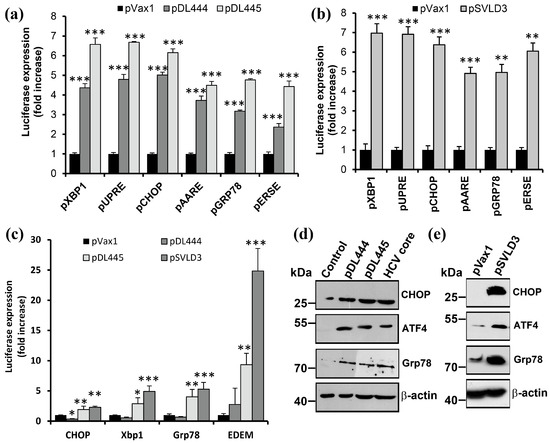 The analysis was performed following several approaches. The first was the usage of reporter plasmids encoding a luciferase under the control of UPR-inducible genes or their consensus response elements: UPRE, ER stress response element (ERSE), or amino acid response element (AARE). The other approaches were standard RT-qPCR and immunoblotting. The results are presented in Figure 5. It can be clearly seen that the overexpression of either HDV antigen or the replication of the viral RNA pronouncedly increased the activity of UPRE-, ERSE-, or AARE-containing promoters (Figure 5a,b), enhanced the transcription of UPR-inducible genes (Figure 5c), and led to their accumulation (Figure 5d,e). It is noteworthy that S-HDAg also caused a strong and statistically significant effect.
