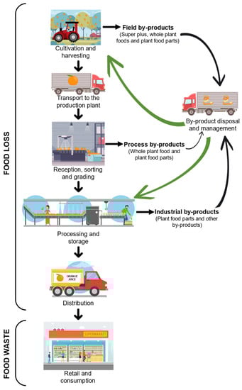 General diagram of by-product generation and management along the food chain. The diagram is based on information that is included in references [2,10].