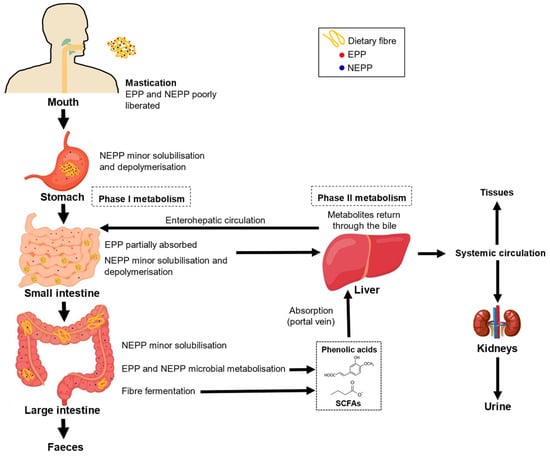 According to the classification of (poly)phenols in EPPs and NEPPs, as is shown in Figure 2, EPPs may be absorbed partially in the intestinal enterocytes of the upper part of the small intestine, because they are not bound to other food components and are, therefore, bioaccessible. The EPPs that are not absorbed in phase I metabolism pass into the colon, where they undergo conversion by microbiota. After microbiota biotransformation into catabolites, some of them may exert gut benefits or may be absorbed in the colon and transported through the portal vein to the liver, where phase II metabolism takes place (Figure 2). Phase II metabolites enter the bloodstream and are finally excreted in urine, while those that are not absorbed are excreted in faeces [80].