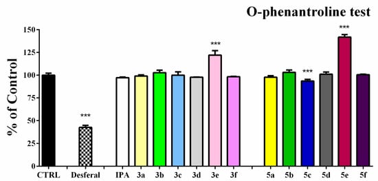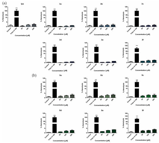 Hemolytic effects of (a) IPA and compounds 3a–f; (b) compounds 5a–f; on human erythrocytes. The results are expressed as means ± SD of triplicate assays (n = 3). All groups were compared statistically vs. untreated controls by one-way ANOVA with Dunnet’s post hoc test *** p < 0.001 vs. control.