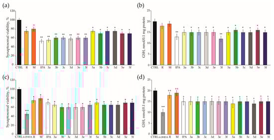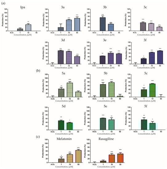 The SH-SY5Y cells were seeded in 96-well plates at a density of 3.5 × 104/well in 100 μL of RPMI supplemented with FBS for 24 h. Then, the cell medium was aspirated, and the cells were treated with different concentrations of the compounds—1, 10, and 50 µM for 90 min. Afterwards, the SH-SY5Y cells were washed with PBS and were exposed to hydrogen peroxide (H2O2) (1 mM in PBS for 15 min) to induce oxidative stress. All well contents were replaced by fresh culture medium and incubated for 24 h. MTT assay was used to evaluate the amount of attached viable cells. Negative controls (cells without H2O2 treatment) were considered as 100% protection and H2O2-treated cells as 0% protection. Melatonin and rasagiline (Sigma-Aldrich Co. LLC, St. Louis, MO, USA) were used as references because of their potent antioxidant and neuroprotective effects, which were established by several in vitro and in vivo studies [,].
