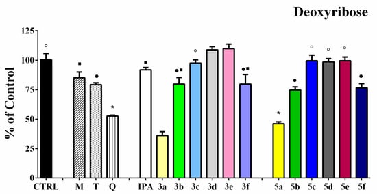 The deoxyribose (0.5 mM) damage was induced by adding FeCl2 (0.1 mM). The measurement compositions were incubated at 37 °C for 30 min. The next step comprised adding 0.5 mL of 2.8% trichloroacetic acid and 0.5 mL of thiobarbituric acid. Then, the samples were heated in boiling water for 20 min, and their absorbance was estimated at 532 nm (characteristic band for the generated chromophore) via Shimadzu UV-1601 UV-vis spectrophotometer.