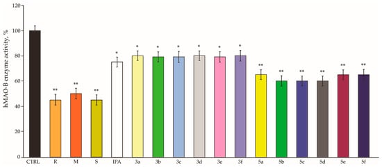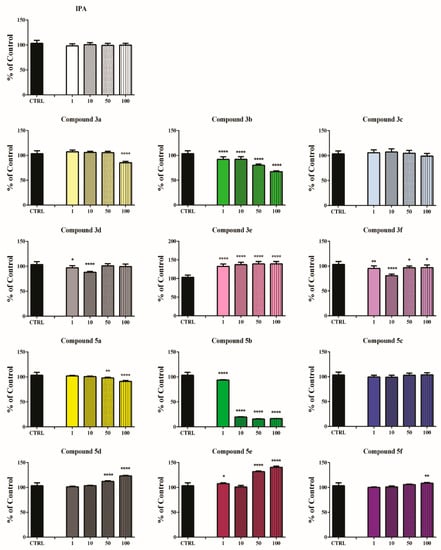 Both the SH-SY5Y and bEnd3 cells were treated with the test compounds in a concentration range from 1 to 500 µM for 24 h. Thereafter, the corresponding IC50 values were calculated (Table 1). The compounds 3e and 3f, as well as the IPA, did not show any significant cytotoxic effects, as the estimated IC50 values were >500 µM, followed by compounds 3b (265.3 µM), 3c (275.2 µM), and 5f (286.9 µM). The relatively higher cytotoxic effect was exhbited by compounds 5a (79.3 µM), 5c (73.9 µM) and 5d (98.2 µM).