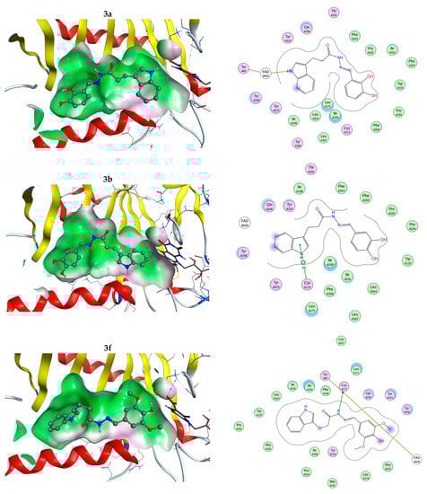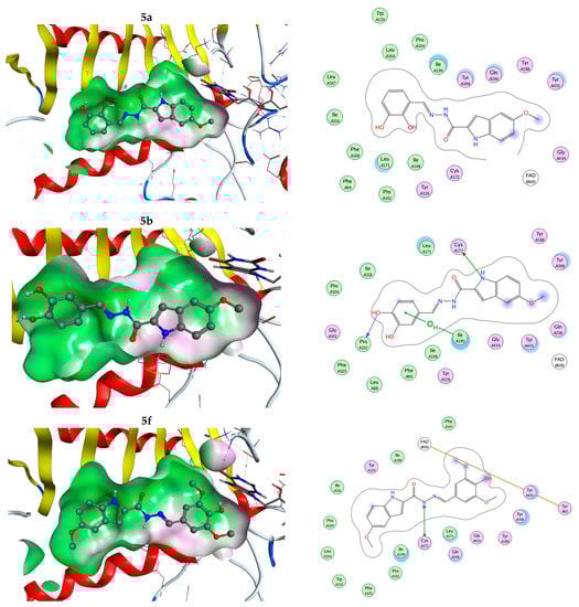 The best 50 poses for every ligand were further optimized with induced fit methodology, using MMFF94x force field and reaction field solvation model. The residues (including FAD molecule) that had atoms closer than 6 Å from any atom of the ligand were considered free during optimization, while the others were considered fixed. The GBVI/WSA dG [] was used as a rescoring function, and the best 30 poses were collected for further analysis.