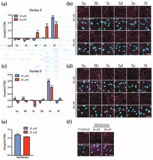 Immunofluorescence of zonula occludens-1 (ZO-1) was performed to determine the in vitro effect of the compounds on tight junctions (TJs) between bEnd3 cells. The experiment was conducted simultaneously with the permeability assay. Briefly, cells were seeded on cover slides in 24-well plates at a concentration of 3.5 × 104 cells/well and incubated for 3–4 d at 37 °C and 5% CO2 in a humidified atmosphere, until they reached 100% confluence. The cells were then treated with 10 and 50 µM concentrations of the compounds for 90 min. After the allotted treatment time, the cells were fixed with ice-cold acetone at −20 °C for 10 min; blocked with 1% bovine serum albumin (BSA, cat. no. 9048-46-8, Acros Organics, Thermo Fischer Scientific, Waltham, MA, USA) in PBS, containing 0.1% Tween® 20 (cat. no. P1379, Sigma-Aldrich Co. LLC, St. Louis, MO, USA); and labeled with anti-ZO-1 (rabbit polyclonal antibody, 1:500, cat. no. ab96587, Abcam, Cambridge, UK) at 4 °C overnight. The slides were then incubated with a secondary donkey anti-rabbit Alexa Fluor™ 555 antibody (1:1000, cat. no. 4413S, Molecular Probes, Thermo Fischer Scientific, Waltham, MA, USA) for 1 h at room temperature (RT) in the dark. Finally, cell nuclei were stained for 5 min/RT/dark with 1 µg/mL 4′,6-diamidino-2-phenylindole (DAPI, D9542, Sigma-Aldrich Co. LLC, St. Louis, MO, USA). The slides were washed with 3 x PBS between each step. Finally, the samples were mounted via Mowiol®4-88 (cat. no. 81381, Sigma-Aldrich Co. LLC, St. Louis, MO, USA). Fluorescence microscopy was performed on a spinning disk confocal microscope system (Andor Dragonfly 505, Oxford Instruments, Abingdon, UK) with 60 × oil NA 1.4 objective, with em./ex. = 561/617 nm for ZO-1 and 405/445 nm for DAPI. The obtained data were analyzed with Fiji [] and compiled via the FigureJ plugin [].