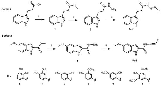 Synthesis of new arylhydrazones of IPA (Series I) and 5-methoxy-indole-2-carboxylate (Series II). Reagents and conditions: (i) thionyl chloride, methanol, refluxing; (ii) hydrazine hydrate, ethanol solution, refluxing; (iii) corresponding aldehyde, ethanol, refluxing.