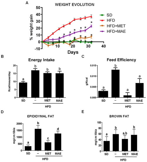 Mice treated with metformin (MET) or Morus alba L. extract (MAE). extract presented lower body weight gain as well as lower fat deposits without a satiating effect. (A) Body weight gain during the time of study. (B) Quantification of energy intake of the different groups of study. (C) Quantification of feed efficiency of different groups of study. (D) Total amount of epididymal fat. (E) Total amount of scapular brown fat. Data are expressed as means ± SEM (n = 8). * p < 0.05 vs. control HFD mice. Groups with different letters statistically differ (p < 0.05). SD: standard diet; HFD: high-fat diet.