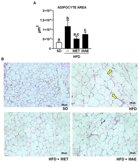 Mice fed with an HFD and treated with metformin (MET) or Morus alba L. extract (MAE) presented lower hypertrophy of adipocytes compared to HFD-untreated mice. (A) Adipocyte area quantification. (B) Representative images of adipocyte area of the different groups of study. Yellow arrows refer to the presence of immune cells. Data are expressed as means ± SEM (n = 8). Groups with different letters statistically differ (p < 0.05). SD: standard diet; HFD: high-fat diet.