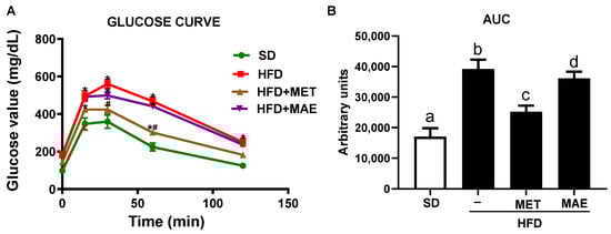 Mice fed with HFD and treated with metformin (MET) or Morus alba L. extract (MAE) presented lower blood glucose levels than untreated mice fed with the same diet. (A) Glucose curve representation of IPGTT. (B) Area under the curve representation of glucose curve. Data are expressed as means ±SEM (n = 8). * p < 0.05 vs. control SD mice and # p < 0.05 vs. control HFD mice. Groups with different letters statistically differ (p < 0.05). SD: standard diet; HFD: high-fat diet.