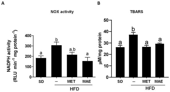 Metformin (MET) and Morus alba L. extract (MAE) treatments presented antioxidant properties in mice fed with an HFD by reducing NADPH oxidase (NOX) activity and TBARS levels. (A) NOX activity quantification in aortic rings. (B) TBARS total amount quantification. Data are expressed as means ±SEM (n = 8). Groups with different letters statistically differ (p < 0.05). SD: standard diet; HFD: high-fat diet; TBARS: thiobarbituric acid reactive substances.