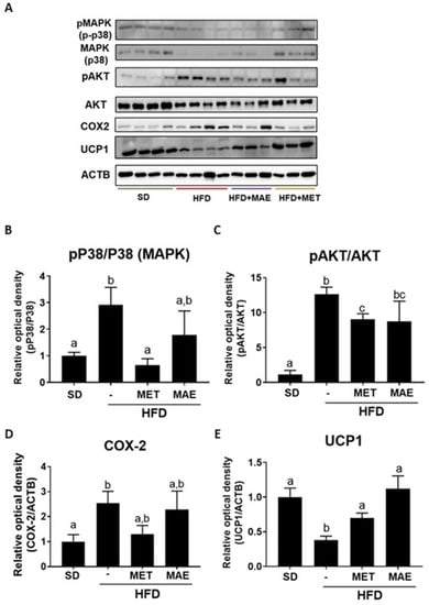 Metformin (MET) and Morus alba L. extract (MAE) treatments reduce the expression of inflammatory proteins in mice fed an HFD, suggesting an antioxidant activity. (A) Representative images of Western blot for each studied protein. (B) Western blot quantification for pP38 (MAPK). (C) Western blot quantification for pAKT. (D) Western blot quantification for COX2. (E) Western blot quantification for UCP1. Data are expressed as means ± SEM (n = 8). Groups with different letters statistically differ (p < 0.05). SD: standard diet; HFD: high-fat diet.