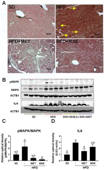 Metformin (MET) and Morus alba L. (MAE) treatments decreased lipid droplets in liver while attenuating p38-MAPK and IL6 expression in HFD-fed mice. (A) Histological images of liver status for each group of study. Yellow arrows refer to fat vacuoles. (B) Representative images of Western blot for each studied protein. (C) Western blot quantification for pP38 (MAPK). (D) Western blot quantification for IL-6. Data are expressed as means ±SEM (n = 8). Groups with different letters statistically differ (p < 0.05). SD: standard diet; HFD: high-fat diet.