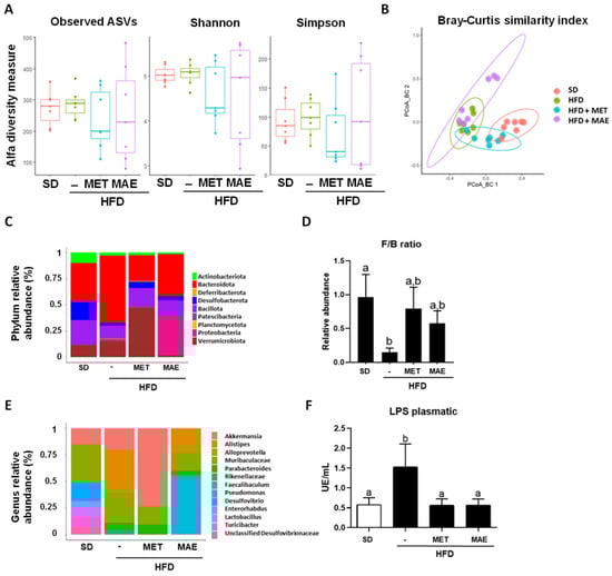 Analysis of gut microbiota composition revealed that treatment with metformin (MET) or Morus alba L. extract (MAE) restored dysbiosis produced by the HFD administration. (A) Alpha diversity index quantification. (B) Beta diversity index represented by Bray–Curtis distance. (C) Relative abundance at phylum level. (D) Quantification of F/B ratio. (E) Relative abundance at genus level. (F) Quantification of plasma LPS levels. Data are expressed as means ±SEM (n = 8). Groups with different letters statistically differ (p < 0.05). SD: standard diet; HFD: high-fat diet.
