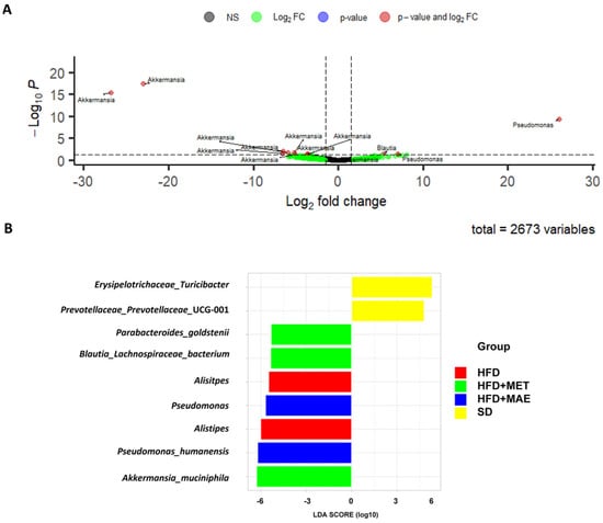 Volcano plot and LEfSe analysis showed specific bacteria increase depending on the administered treatment. Morus alba L. extract (MAE) presented a statistically significantly higher abundance of Pseudomonas. (A) Volcano plot showing differential abundance taxa of Morus alba L.-treated mice vs. metformin (MET)-treated mice. (B) Linear discriminant analysis (LDA) effect size (LEfSe) plot of taxonomic biomarkers (p value = 0.05 and LDA value = 3) (n = 8). SD: standard diet; HFD: high-fat diet.
