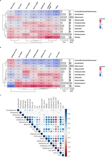 In order to analyze the influence of these specific bacteria, we performed different correlation studies. First, we observed the association between the most abundant bacteria of all groups with physiological parameters (Figure 9A) and protein levels (Figure 9B). In both cases, Alistipes, which was the most abundant bacteria of the HFD group, was strongly correlated with the studied variables. In addition, it showed a negative correlation for UCP1 levels, which was in accordance with the protein levels obtained in epididymal fat.