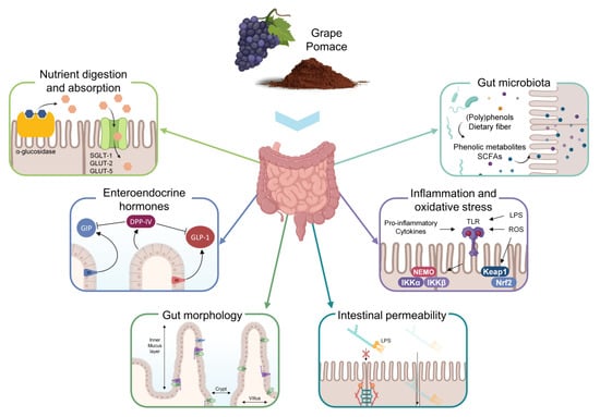 Grape pomace (GP) is a winemaking by-product particularly rich in (poly)phenols and dietary fiber, which are the main active compounds responsible for its health-promoting effects. These components and their metabolites generated at the intestinal level have been shown to play an important role in promoting health locally and systemically. This review focuses on the potential bioactivities of GP in the intestinal environment, which is the primary site of interaction for food components and their biological activities. These mechanisms include (i) regulation of nutrient digestion and absorption (GP has been shown to inhibit enzymes such as α-amylase and α-glucosidase, protease, and lipase, which can help to reduce blood glucose and lipid levels, and to modulate the expression of intestinal transporters, which can also help to regulate nutrient absorption); (ii) modulation of gut hormone levels and satiety (GP stimulates GLP-1, PYY, CCK, ghrelin, and GIP release, which can help to regulate appetite and satiety); (iii) reinforcement of gut morphology (including the crypt-villi structures, which can improve nutrient absorption and protect against intestinal damage); (iv) protection of intestinal barrier integrity (through tight junctions and paracellular transport); (v) modulation of inflammation and oxidative stress triggered by NF-kB and Nrf2 signaling pathways; and (vi) impact on gut microbiota composition and functionality (leading to increased production of SCFAs and decreased production of LPS). The overall effect of GP within the gut environment reinforces the intestinal function as the first line of defense against multiple disorders, including those impacting cardiometabolic health. Future research on GP’s health-promoting properties should consider connections between the gut and other organs, including the gut-heart axis, gut-brain axis, gut-skin axis, and oral-gut axis. Further exploration of these connections, including more human studies, will solidify GP’s role as a cardiometabolic health-promoting ingredient and contribute to the prevention and management of cardiovascular diseases.