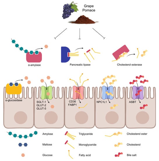 In brief, GP’s impact on nutrient digestion and absorption is multifaceted, mediated by its high content of dietary fiber and (poly)phenols, as summarized in Table 2. GP can physically impede nutrient absorption and regulate intestinal enzymes, as mentioned above. Furthermore, GP can modulate the expression of intestinal transporters, such as SGLT1, GLUT2, and NPC1L1, affecting the absorption of sugars and lipids. These mechanisms contribute to better glycemic control and reduced serum cholesterol levels, potentially lowering the risk of cardiovascular diseases. Gaining a deeper understanding of these mechanisms will provide valuable insights into the potential health benefits of GP and its role in modulating metabolic processes and promoting cardiovascular health.