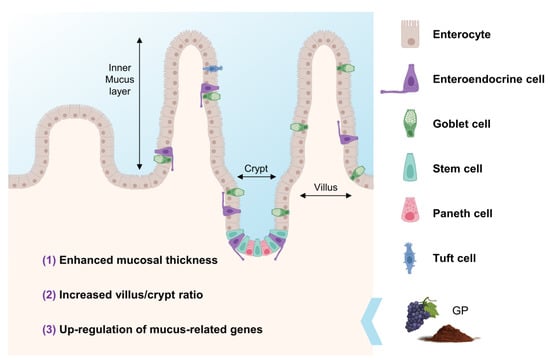In this line, several authors reported increased villus length [52,78] or villus height/crypt depth ratio [78,79,80,81] and decreased crypt depth [81,84] in the jejunum, ileum, and colon cells from rodents, lambs, pigs, and broilers fed with GP-derived products. These products were also responsible for reducing the colonic lesion and colon shortening in rats subjected to stressful DSS and TNBS treatments [77,85], with the dietary fiber and fiber-bound (poly)phenols of the GP being more effective than free (poly)phenols [85]. This response may be a consequence of the increase in villin, a calcium-regulated actin-binding protein inhabiting the intestinal brush border and related to epithelial differentiation, which in turn was responsible for the rise in goblet cell density [52]. In contrast, these outcomes enhance mucosal thickness promoted by GP products [52] and upregulation of genes involved in extracellular mucin secretion (i.e., Muc1, Muc2, and Muc3) [82,83]. Furthermore, as a secondary issue derived from the consumption of GP (poly)phenols, it has also been described the enhanced expression of genes related both to nutrient transporters in general [52] but specifically to (poly)phenols absorption [82].